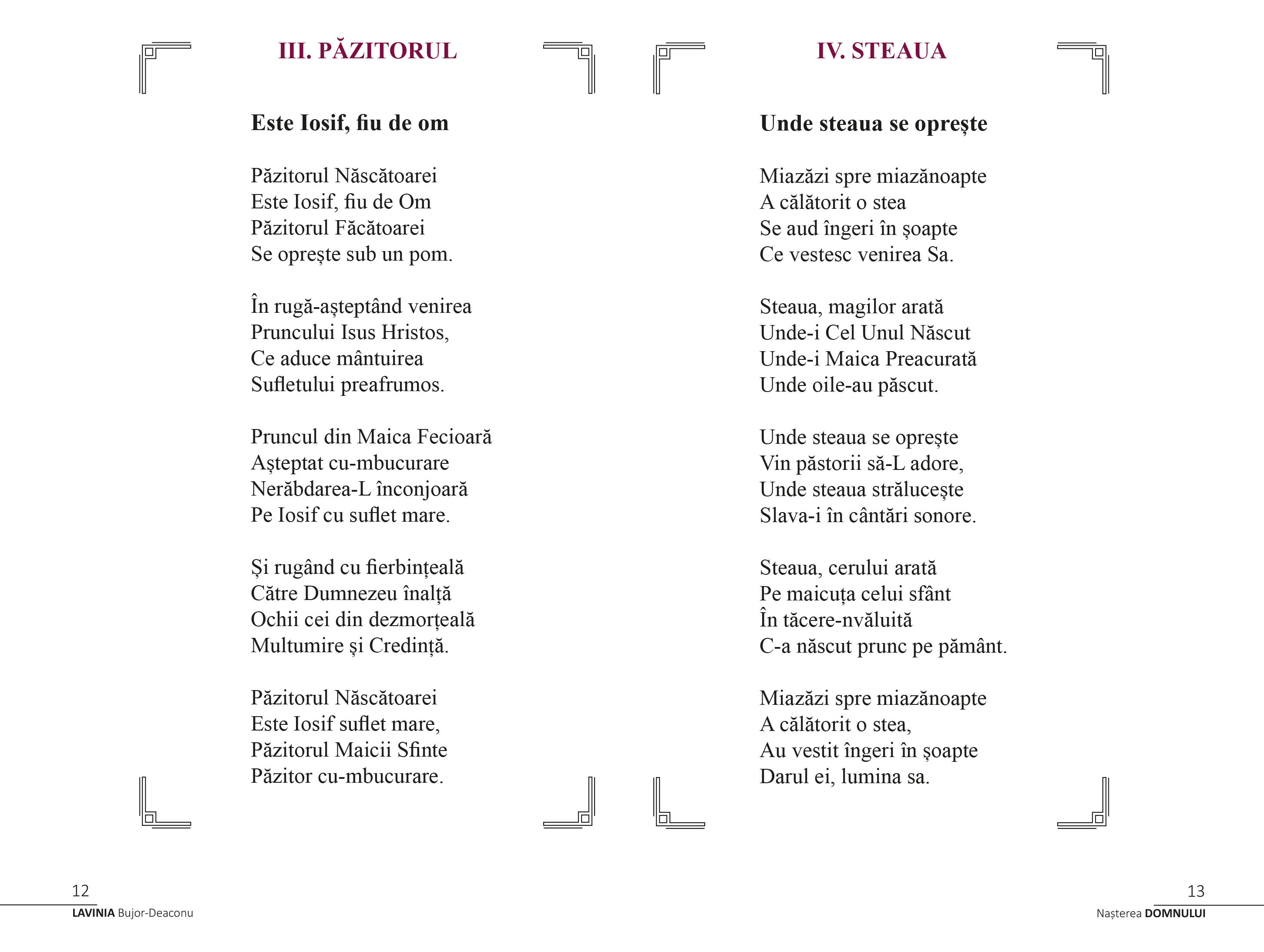 "Scrierea volumului de poezie "Nasterea Domnului" a fost intr-o mare masura determinata de un sentiment de recunostinta. Traiesc convingerea existentei lui Dumnezeu iar zilele si noptile sunt ca darurile primite, parca pentru a vedea cum cosmosul nu ramane dator niciodata. Cele 9 poezii de fata, 9 personaje, 9 tablouri, creioneaza o sarbatoare ce rasuna mereu in inimile noastre invatandu-ne din tainele si drumul vietii."